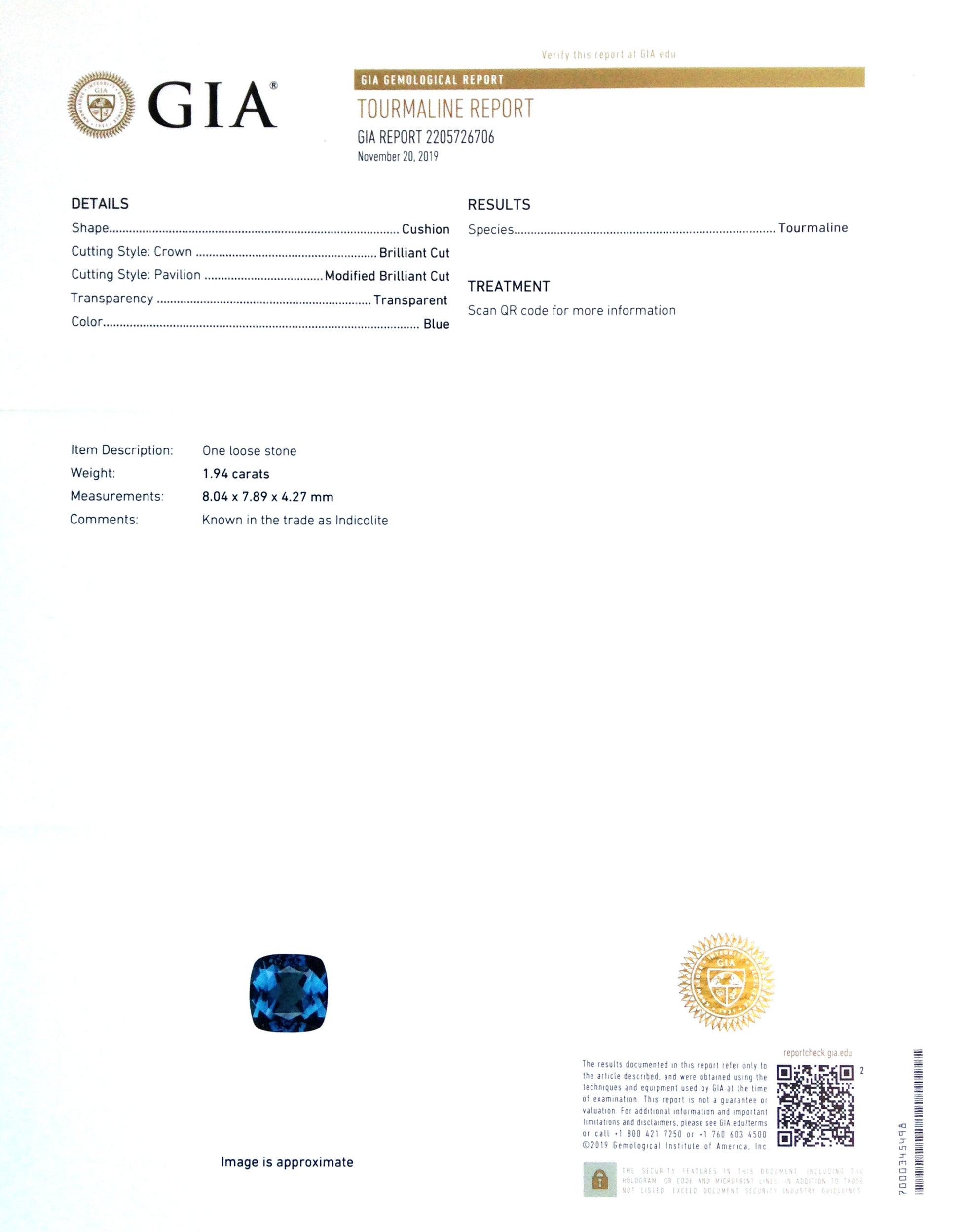 Natural Cushion-shape 1.94 carat Blue Indicolite - GIA Certified