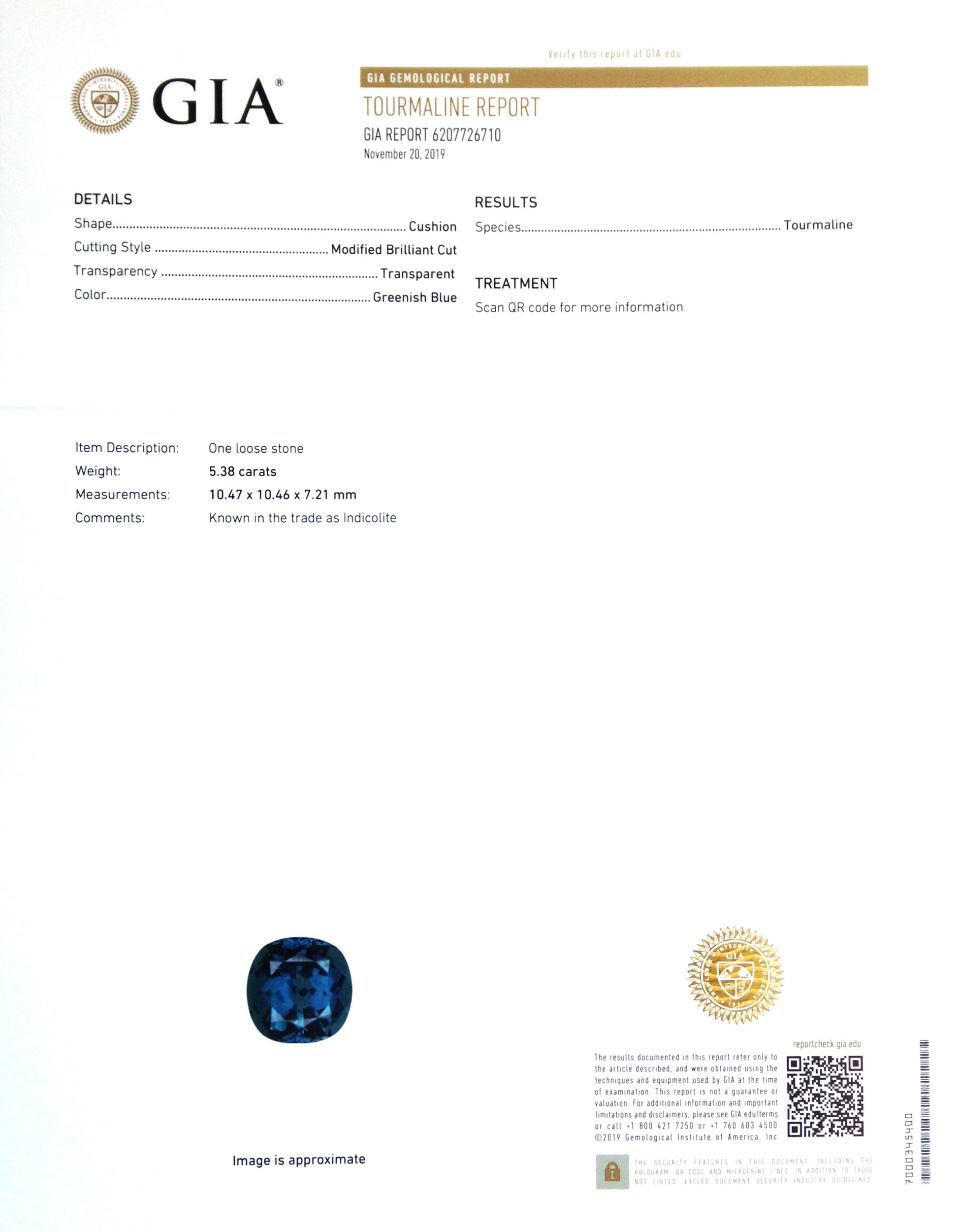 Natural Cushion-shape 5.38 carat Greenish Blue Indicolite - GIA Certified