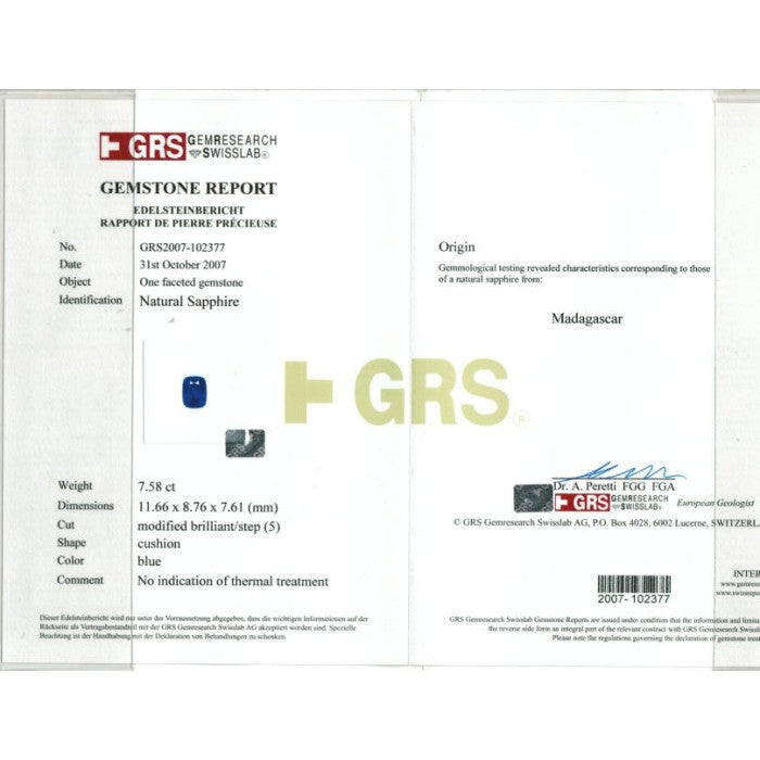 Natural Extremely Rare Unheated Blue Sapphire Cushion-shape 7.58 carats with GRS Report