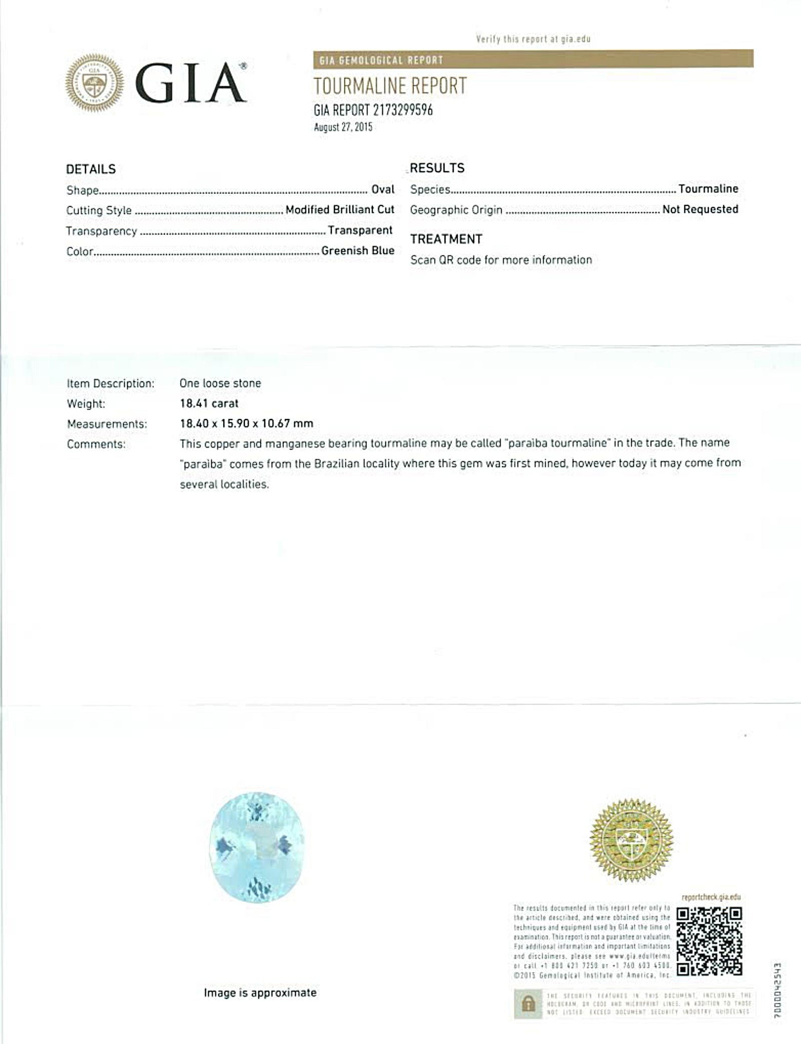 - 1 Modified Brilliant Oval-shape Paraiba Tourmaline weighs 18.41 carats