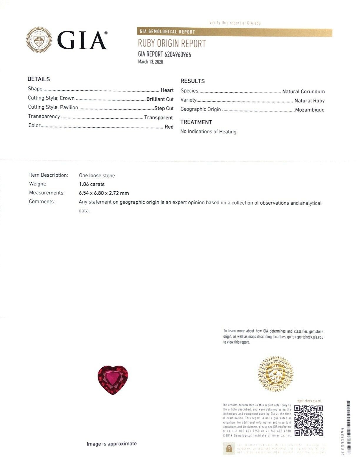 Classic and elegantly stylish, here is a richly colored red Ruby. Cut as a heart that weighs 1.06 carats, this unheated gemstone is both beautiful and resilient. Mined in Mozambique, this rare gemstone comes with a certificate and will symbolize love and passion beautifully.