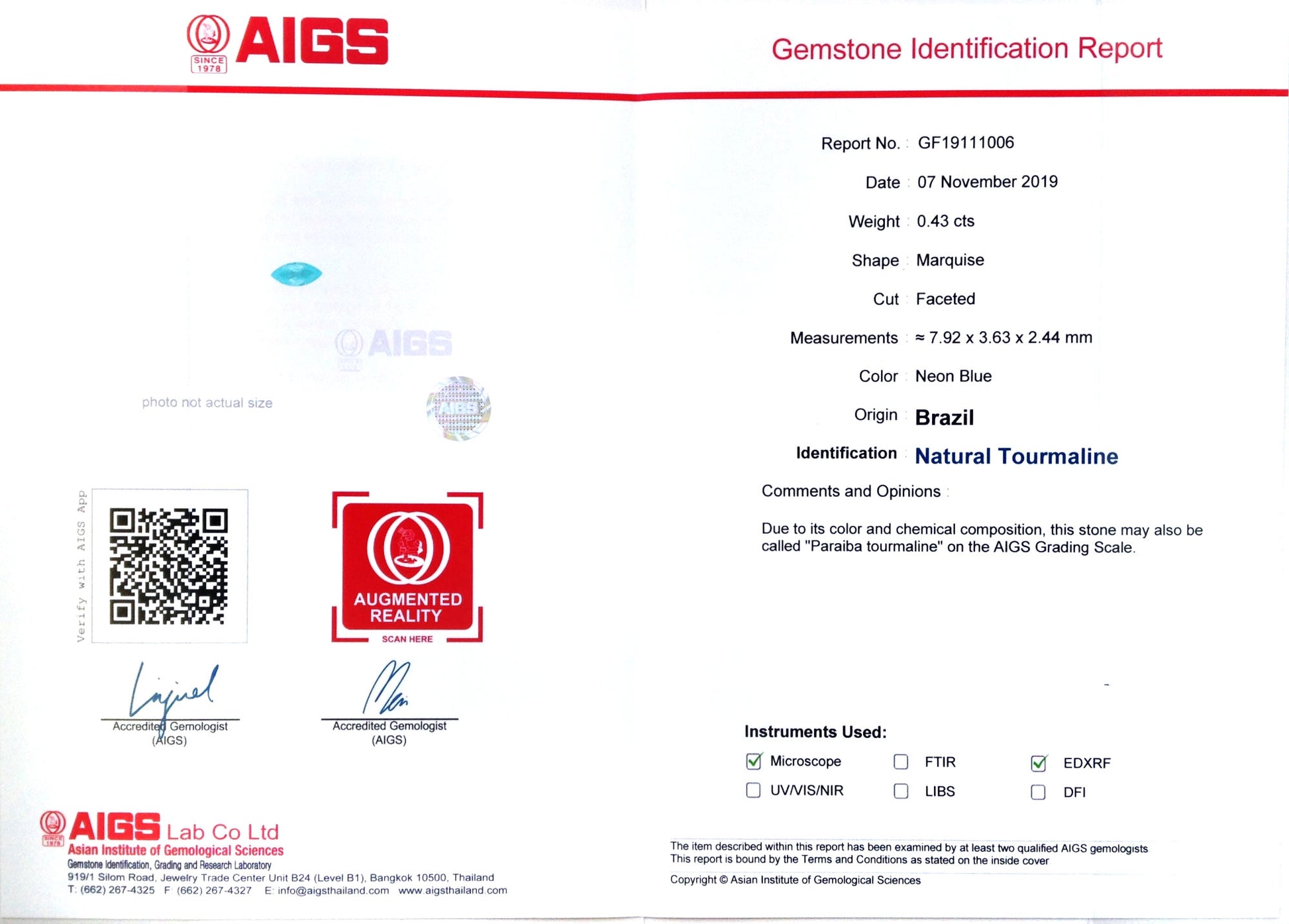 - 1 Paraiba Tourmaline weighs 0.43 carats