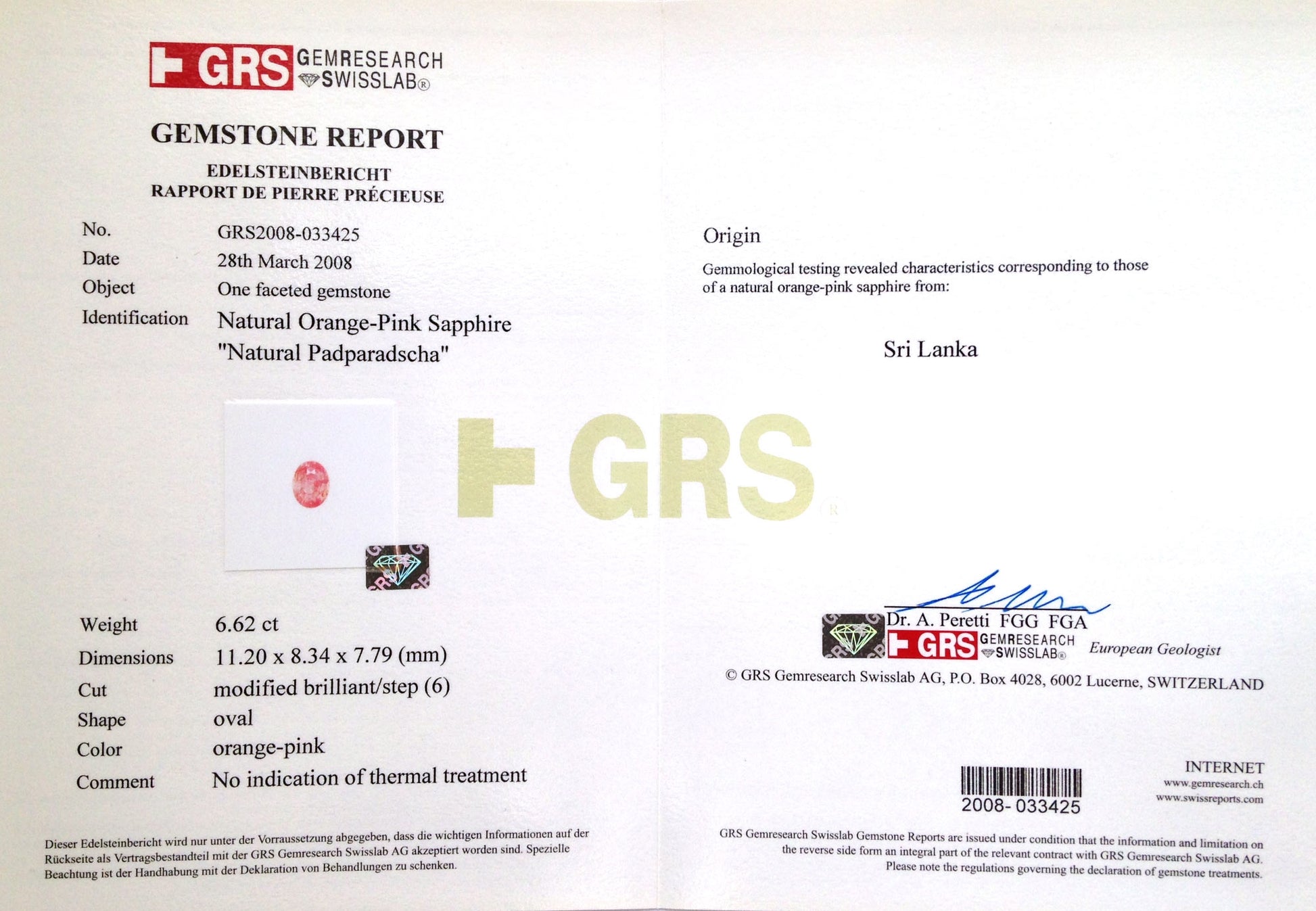Natural Oval-shape 6.62 carat Orange-Pink Padparadscha Sapphire - GRS Certified