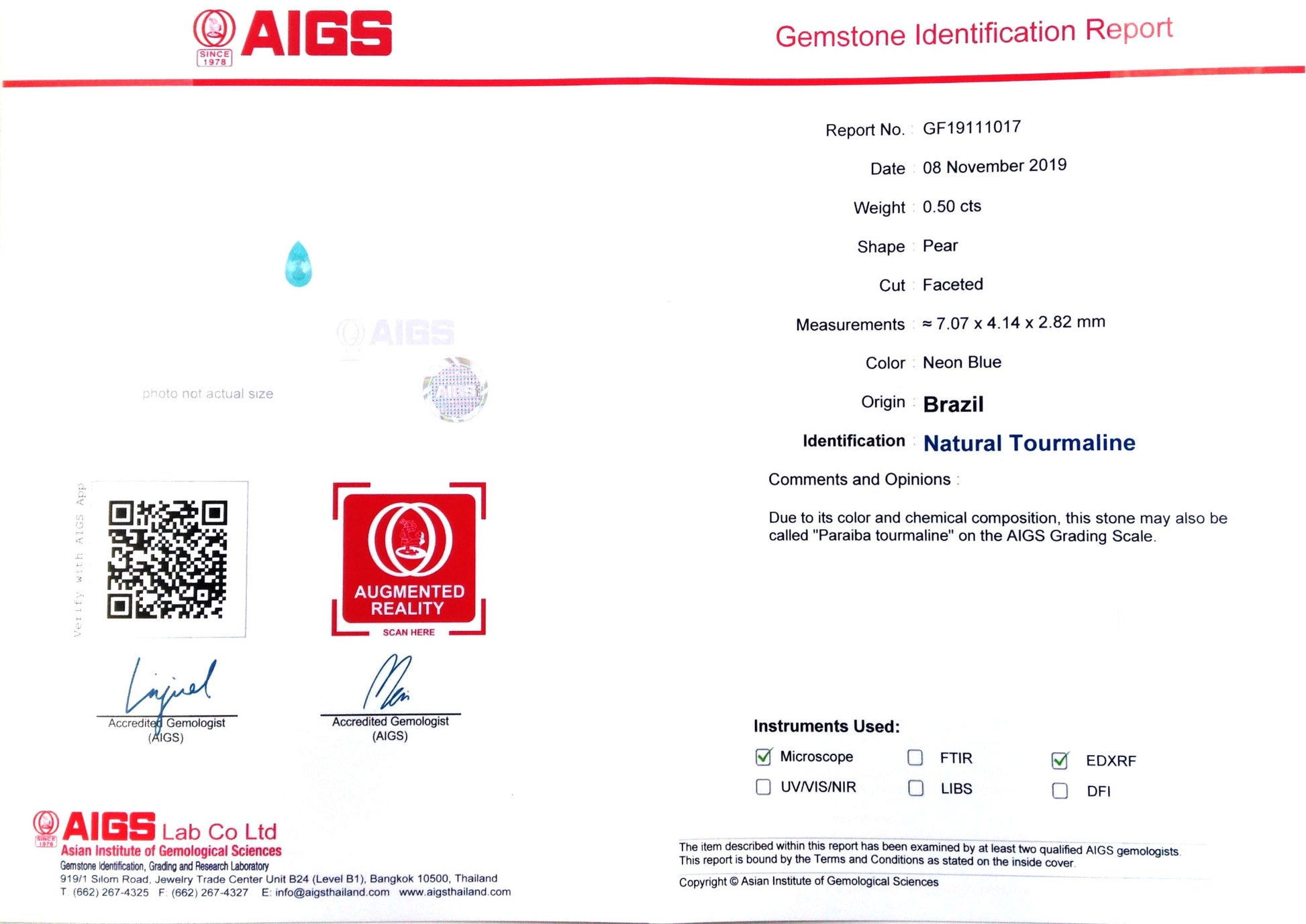Natural Pear-shape 0.5ct Neon Blue Brazilian Paraiba Tourmaline - AIGS Certified