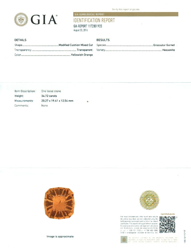 Weighing an unmatched 34.72 carats, this yellowish-orange Hessonite Garnet is a beautiful gem. Cut as a unique cushion it will surely be a statement piece. Eye clean and supported by a GIA certificate it will undoubtedly make a lovely present. Seductively elegant, the gemstone radiates a warm color of fall.