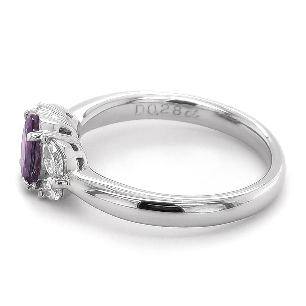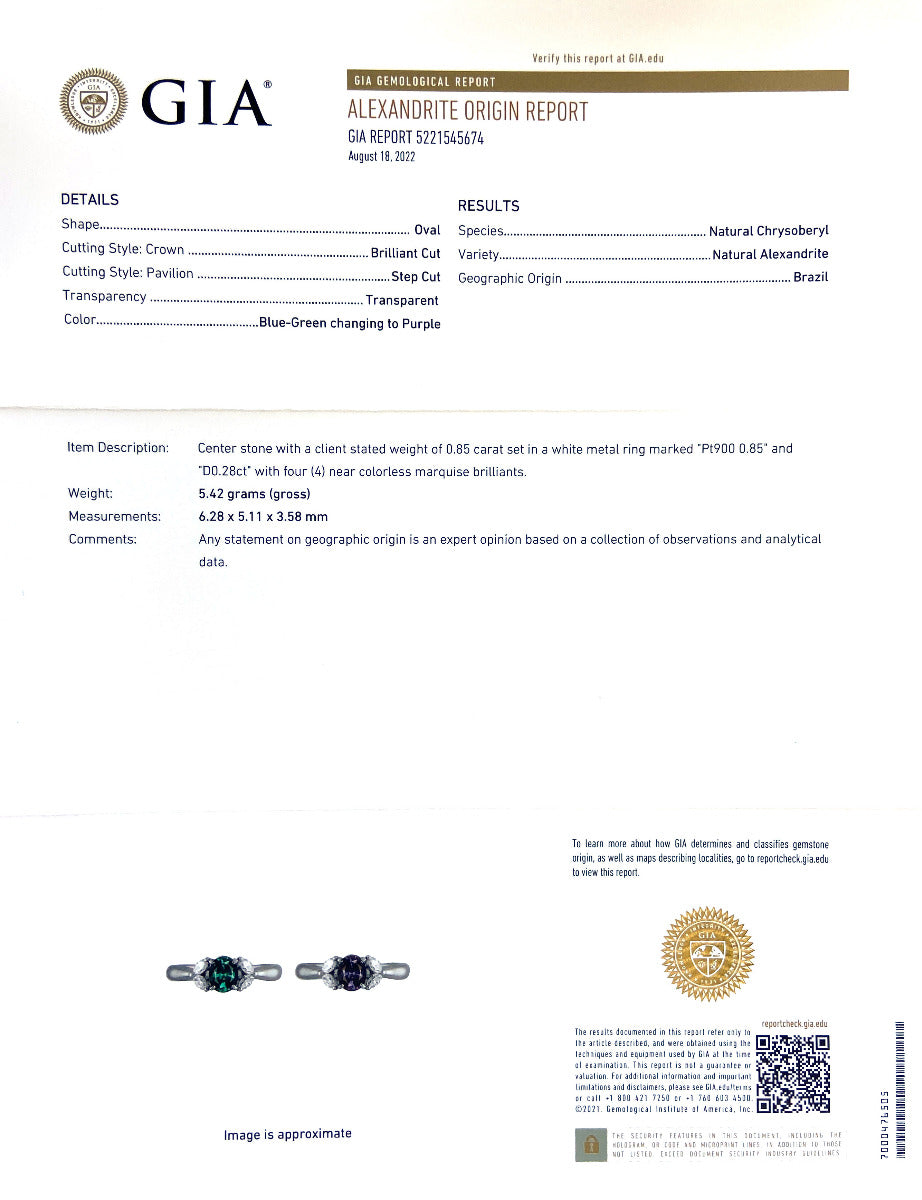 A rare color-change alexandrite and diamond ring. This natural 0.85 carats Brazilian Alexandrite changes color from blue-green in daylight to purple in artificial light. Once only obtainable by czars and royalty, alexandrites are prized by gem connoisseurs and collectors. A brilliant cut and oval shape are accented with 0.28 carats of diamonds decorating the sides of this unique platinum ring.