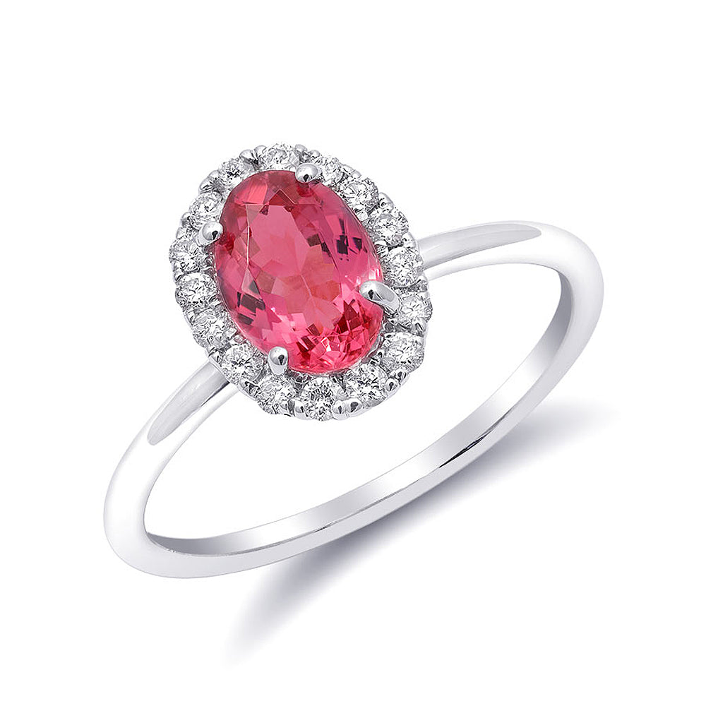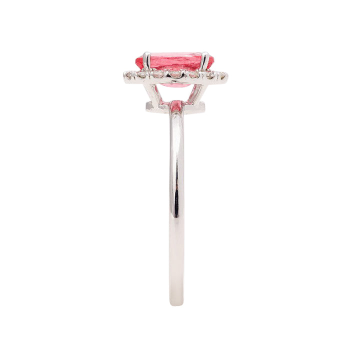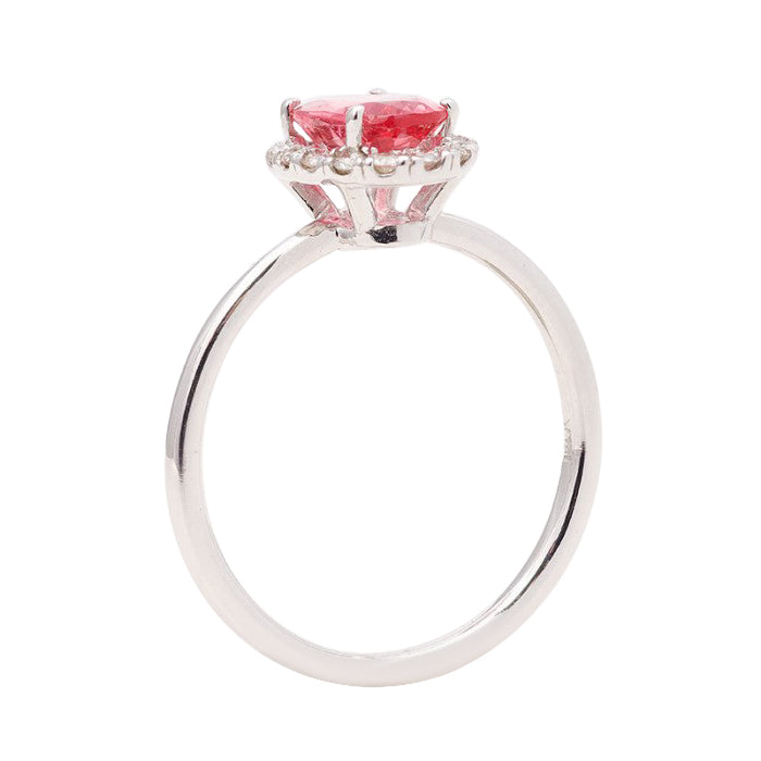 Simple and sparkling, this ring has a neon Spinel placed at its center with diamonds that appear to be a radiating ring surrounding the gem. Mined in Tanzania, this Spinel with good clarity and an even tone is a rare sight. A simple yet chic option, she will surely love this 14K white gold ring.