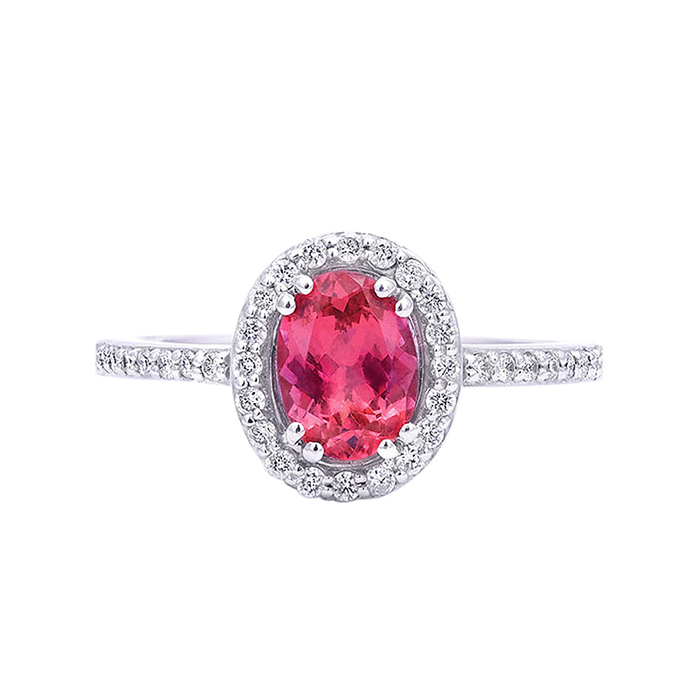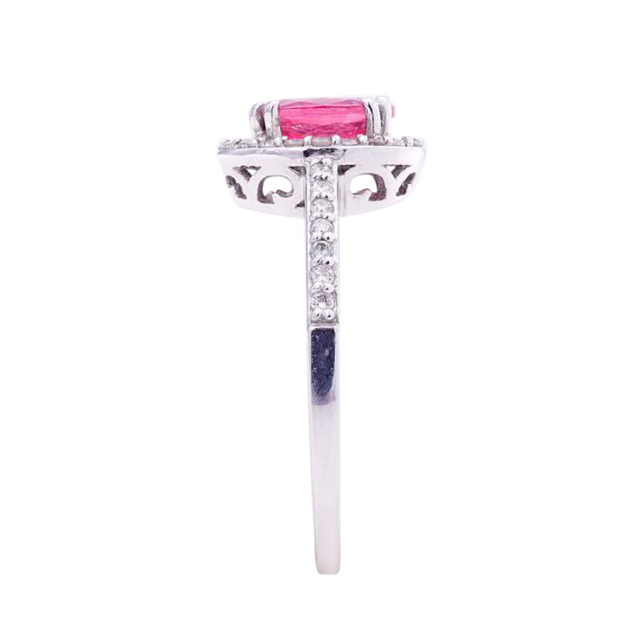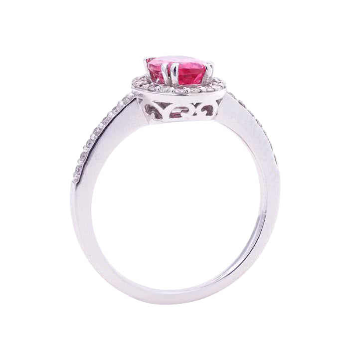 Deep, neon pink, this Spinel from Tanzania weighs 0.98 carats and has an irreplaceable color. Set within strong 14K white gold prongs, this ring will highlight any skin tone. A crown with 0.22 carats of diamonds surrounds the center spinel bringing both light and brilliance to the ring. With a crown like this, she will surely feel like a queen.