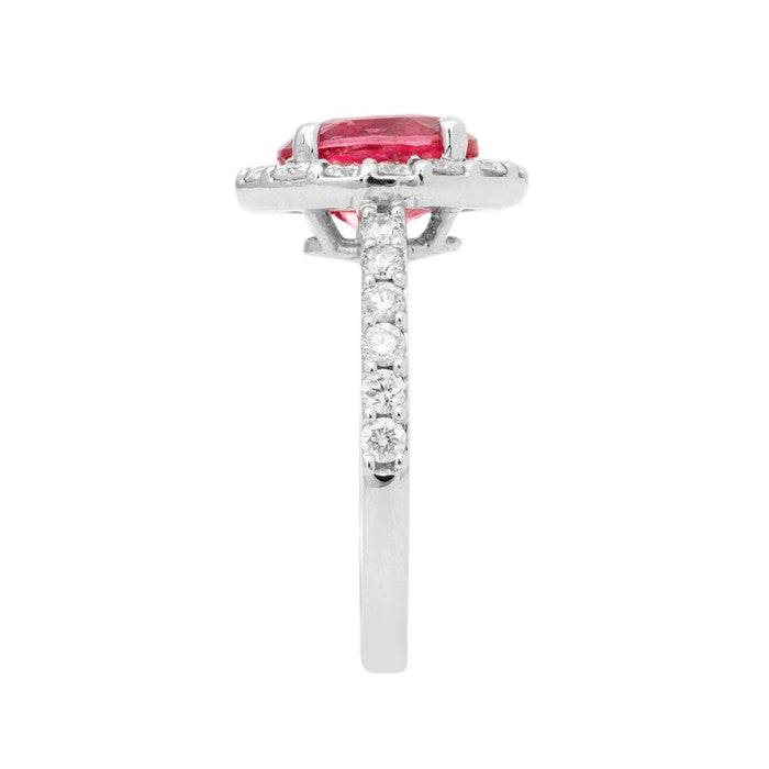 Neon pink mined in Tanzania, this Spinel cannot be matched. Its elegant color can flatter any skin tone. Forged in 14K white gold, with perfectly matched prong set diamonds the rings instantly gets a cool aura around the warm hues of the center stone. Weighing 2.36 carats, this natural spinel will steal your heat.