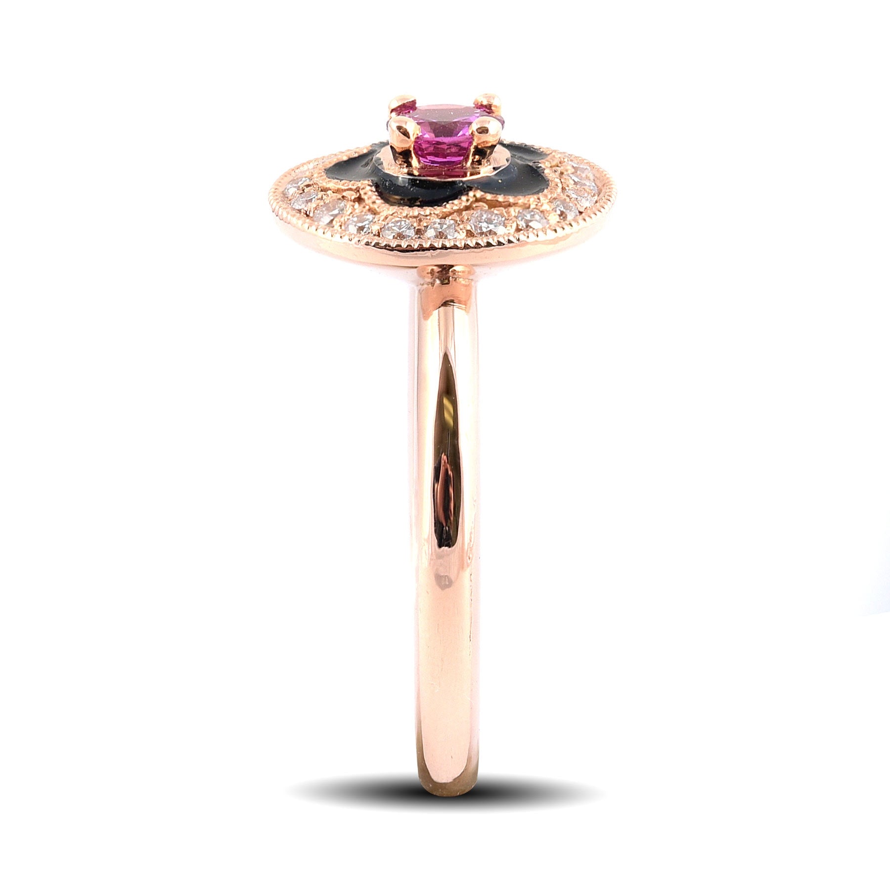 Resting in the center of this art deco inspired ring features a 1/3ct TGW pink sapphire. The raised halo design is accentuated with crisp black enamel to make the pinkish-red of the stone stand out. Round-cut white diamonds weighing an additional 1/6ct TDW enhance the intricately milgrain designed look. This ring is crafted of 14-karat rose gold.