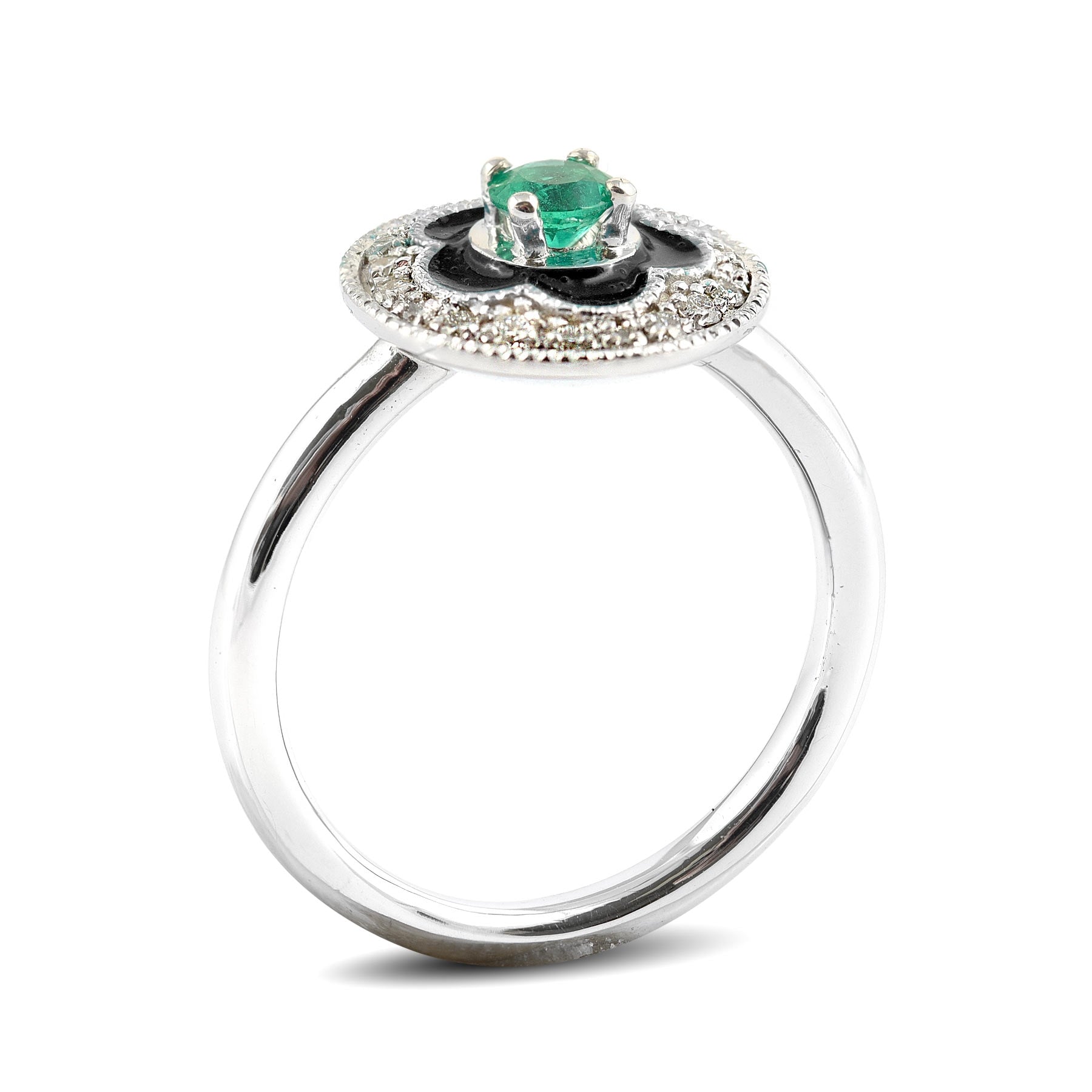 Resting in the center of this art deco inspired ring features a 1/6ct TGW stunning green emerald. The raised halo design is accentuated with sharp black enamel to make the green of the stone stand out. Round-cut white diamonds weighing 0.18ct TDW enhance the intricately milgrain designed look. This ring is crafted of 14-karat white gold.
