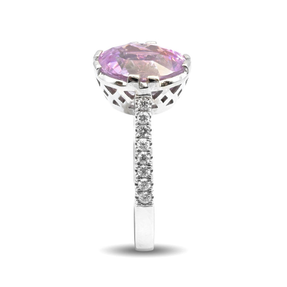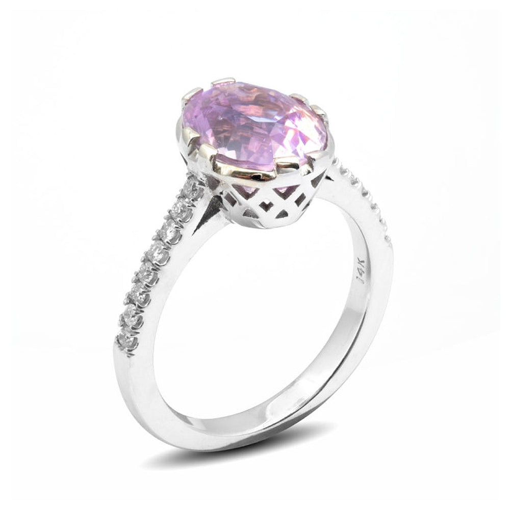 Orange-pink and delicate in color this Padparadscha sapphire is the perfect combination of the colors seen in the lotus flower, from which this gem gets its exquisite color. Weighing 4.10 carats, the Padparadscha is set within brilliant diamonds that add all the more sparkle to the ring. With a GRS certificate, this gemstone ring will be a valuable investment.