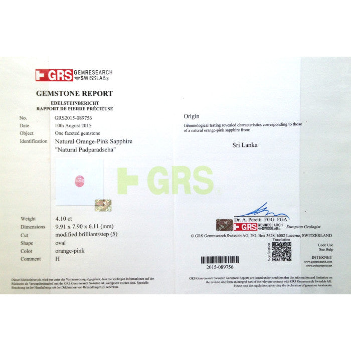 - 1 Oval-shape natural Padparadscha Sapphire from Sri Lanka weighs 4.1 carats