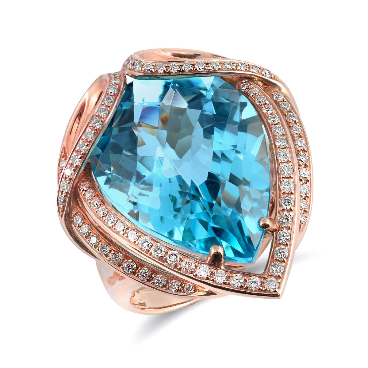 Exquisitely crafted, this 18-karat rose gold piece of art is hand made with a 20.16 carat Swiss topaz of the most gorgeous aqua blue. The pear shaped topaz is accentuated with folds of gold lined with ½ carat TDW of round-cut white diamonds encapsulating the center stone.