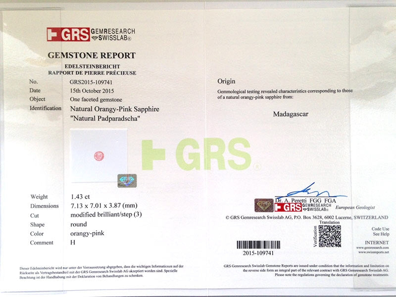 - 1.43 Round-shape Natural Padparadscha Sapphire from Madagascar weighs 1.43 carats