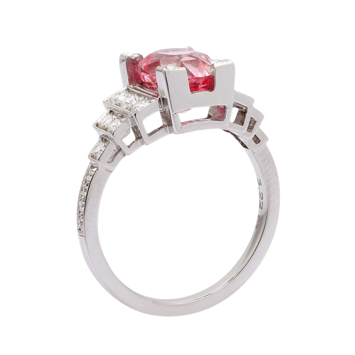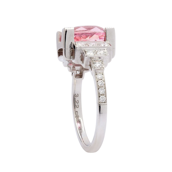 This ring takes its inspiration from the art deco period and uses a geometric shape to create a step-like mounting holding the 3.22 carat Padparadscha sapphire in place. With a faint orangey pink color it is the perfect sunset color giving a pastel look. If you love lighter shades, this eye clean Padparadscha, set in platinum, supported by a GRS certificate should definitely be on your list.