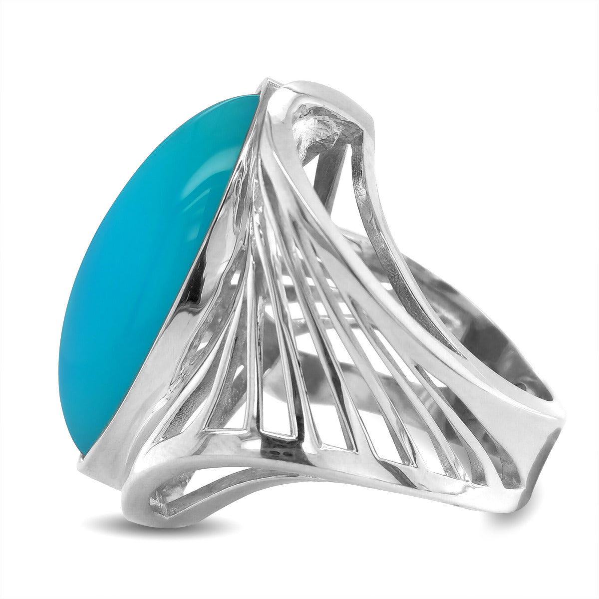 Create waves of unique style with this innovative custom 925 sterling silver ring, finely crafted in a bright shine. An elongated marquise cabochon dyed/enhanced "Paraiba" agate nestles in a bezel setting in the middle. An asymmetrical wave shank reveals contemporary open work and geometric shapes made to get noticed.