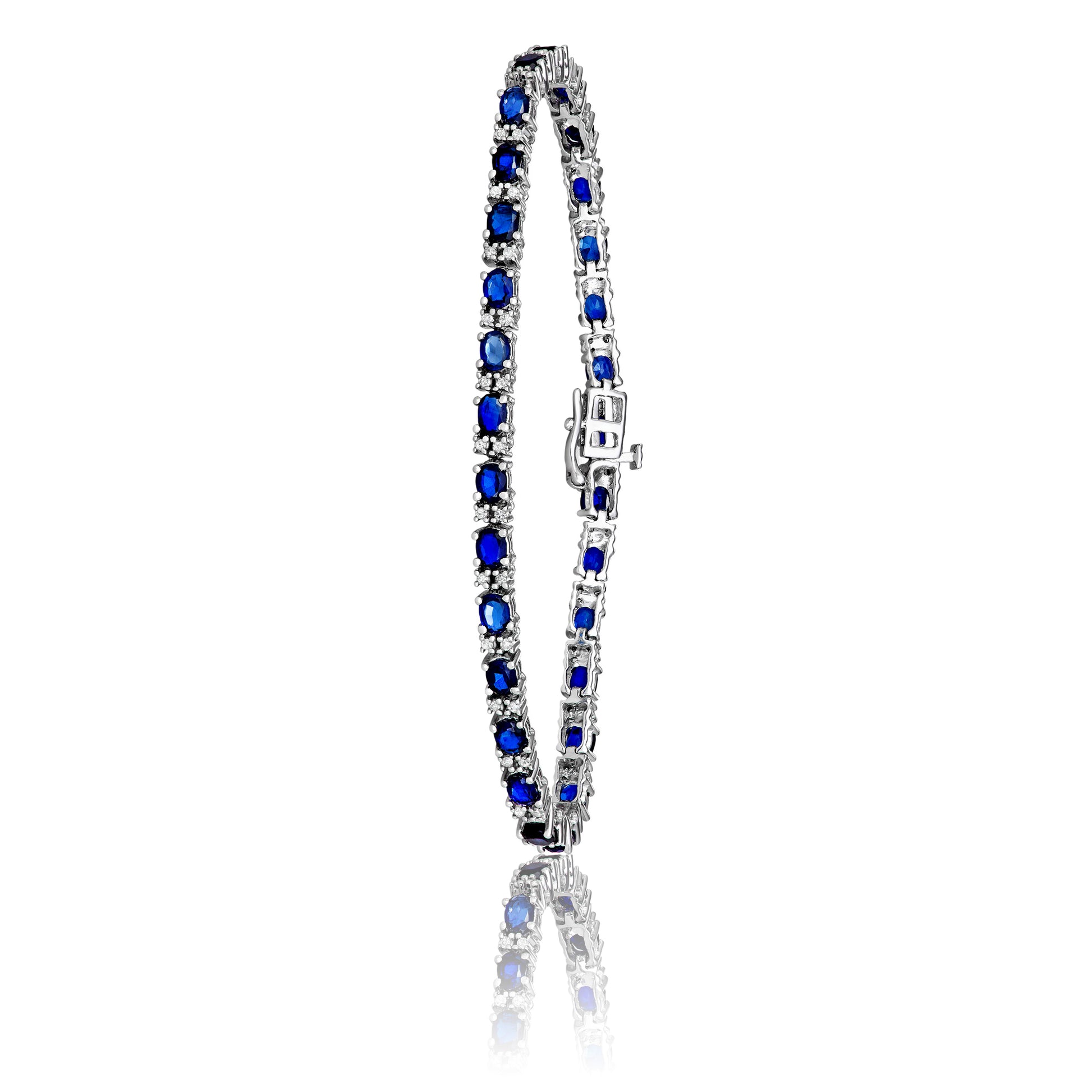 Deep blue sapphires are accentuated by the sterling silver setting of this 8 inch bracelet. The oval-cut sapphires weigh 6.50 carats TGW and are set in between round-cut white diamonds weighing 0.50 carat TDW. The bracelet secures with a box clasp. This beautiful gemstone bracelet would dazzle with any outfit you paired it with.